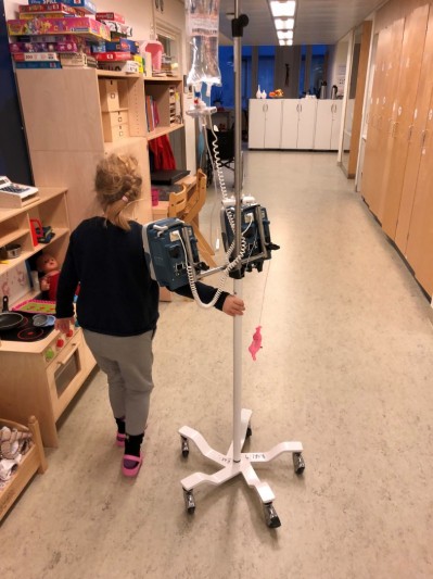 Bilete: 1) Solveig i sjukehuskorridoren med transfusjonsvæske på hjul.