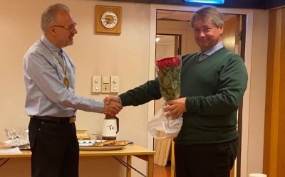 Presidentskiftet: Innkomande president Knut Martin Molnes med kjedet på plass, overrekkjer blomster og takkar past president Roger Kornberg for solid innsats.