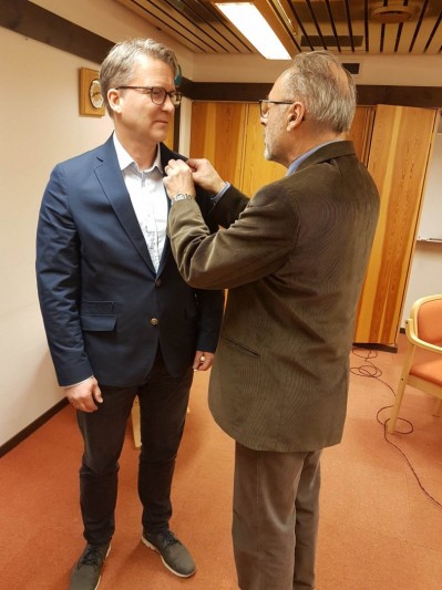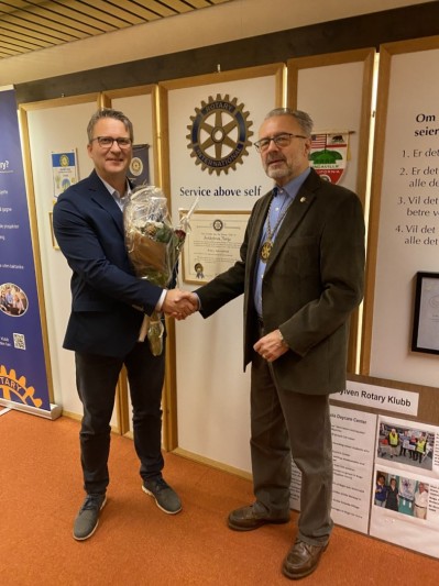 Fadder, Arild Sporsheim, presenterte Svein Erik og President Knut Molnes sette på Rotarynåla som ei stadfesting av medlemskapet.