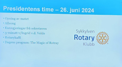 1. Vår nye president Nils Arve Schwarts ønska velkommen til siste møte før ferien. Han presenterte programmet for kvelden ved hjelp av storskjerm på veggen, slik førre president Knut Henning Aursnes hadde teke til med, etter oppgraderinga av lokalet.