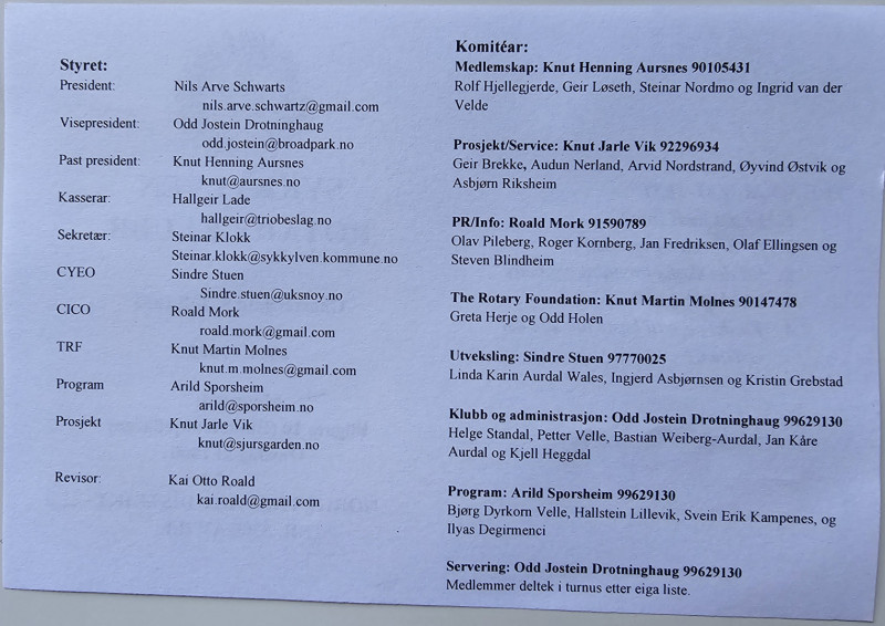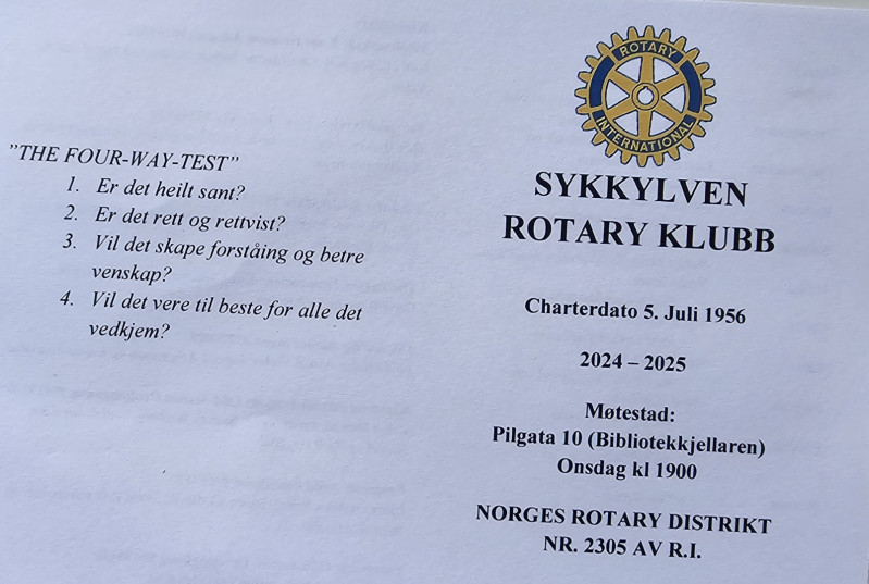 Sjå gjerne https://d2290.rotary.no/no/distriktshandboka-2024-2025 Mellom anna er polio nesten utrydda på jorda. Unntaka er Pakistan og Afghanistan, der det enno finst einskilde tilfelle i avsidesliggande strøk. Bak linken over her, finn vi også hennar presentasjon frå Rotary International Assembly, den 8. januar. Ta deg gjerne eit kvarter på PC-en og opplev ho, så godt som «live». Etter orienteringa fekk vi fem minutt til avsluttande prat, før president Nils Arve kunne avslutte sitt første ordinære (og vellykka) møte. Vel heim!